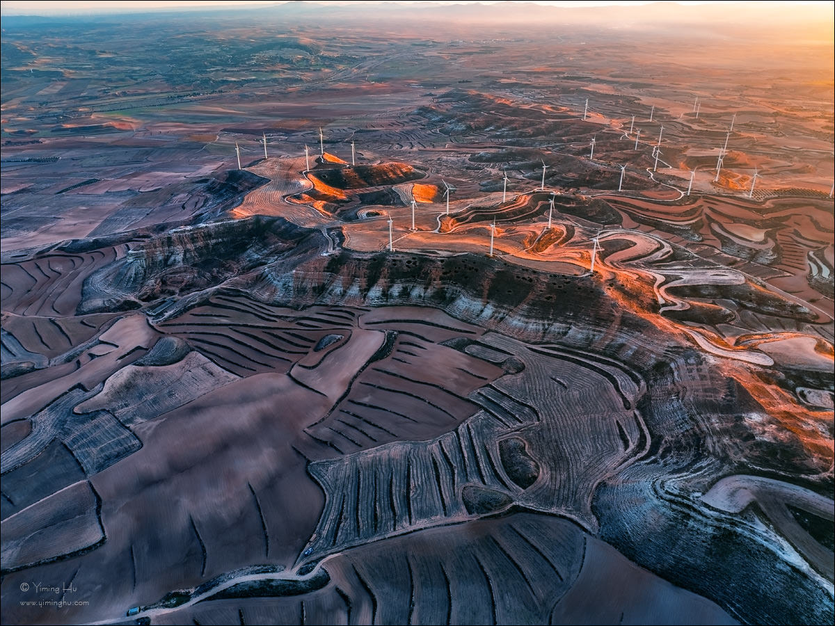 日落前最后几分钟的低角度光线掠过起伏的丘陵,将风力发电机、道路与耕作留下的痕迹逐一照亮