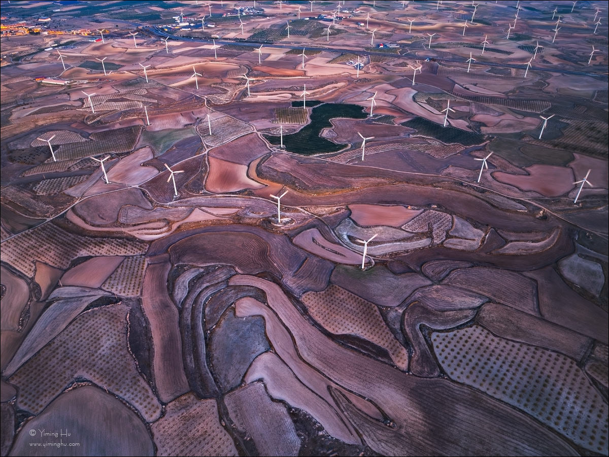 航拍视角下,起伏的农田与成排分布的风力发电机共同构成一套高度组织化的地表结构。自然地形仍然可辨,但已在长期耕作与能源设施的介入下,被重新划分与塑造